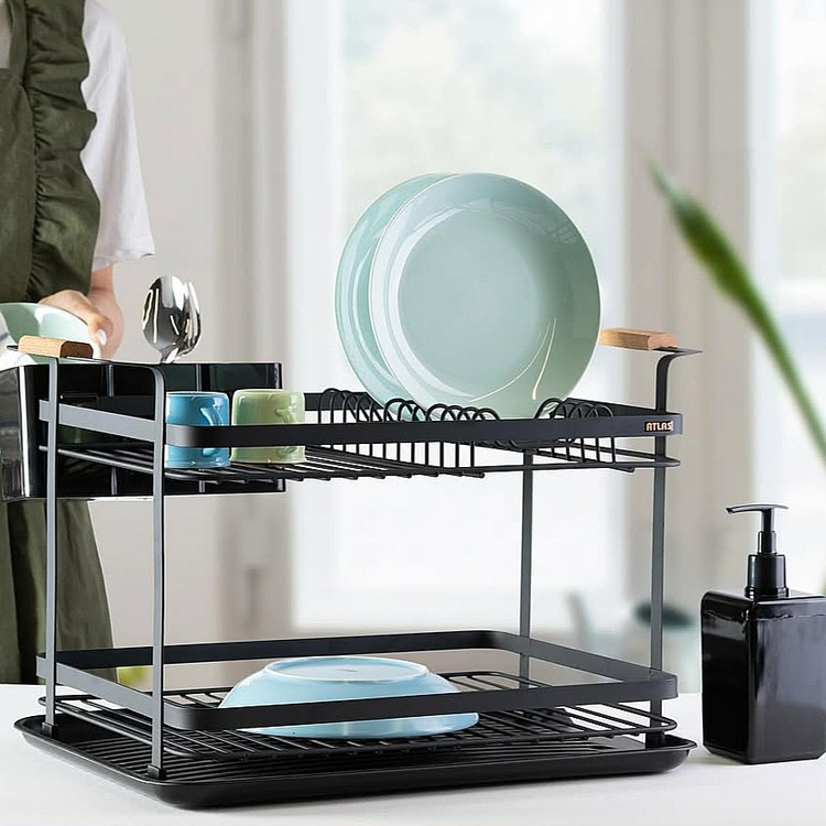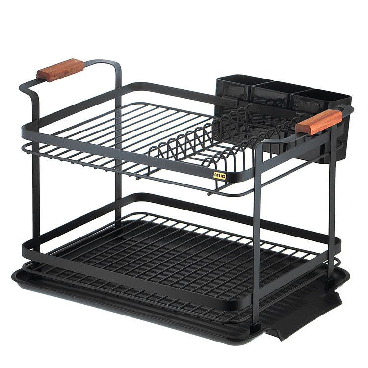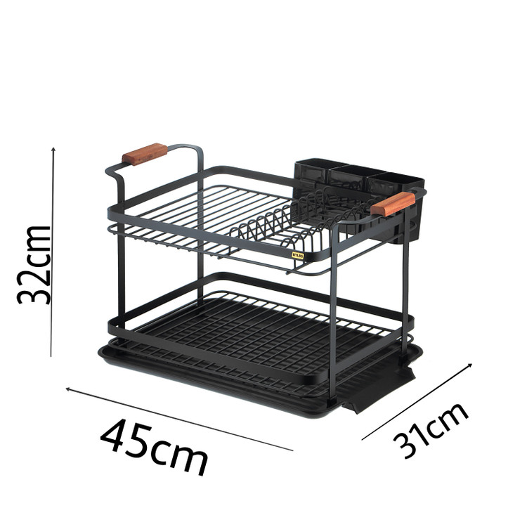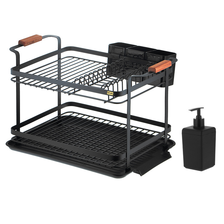 آبچکان کنار سینک فلزی مشکی مات دسته چوبی دارای یک عدد جا مایع هدیه