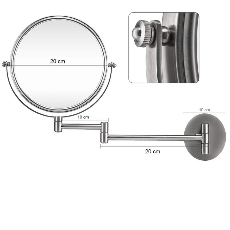 آینه دو طرفه آرایشی بازویی قابل نصب به دیوار و با بزرگنمایی 3 برابر و بدنه تماما استیل است و میتوانید به راحتی و بدون نگرانی از زنگزدگی در محیطهای مرطوب مثل حمام و سرویس بهداشتی استفاده کنید.