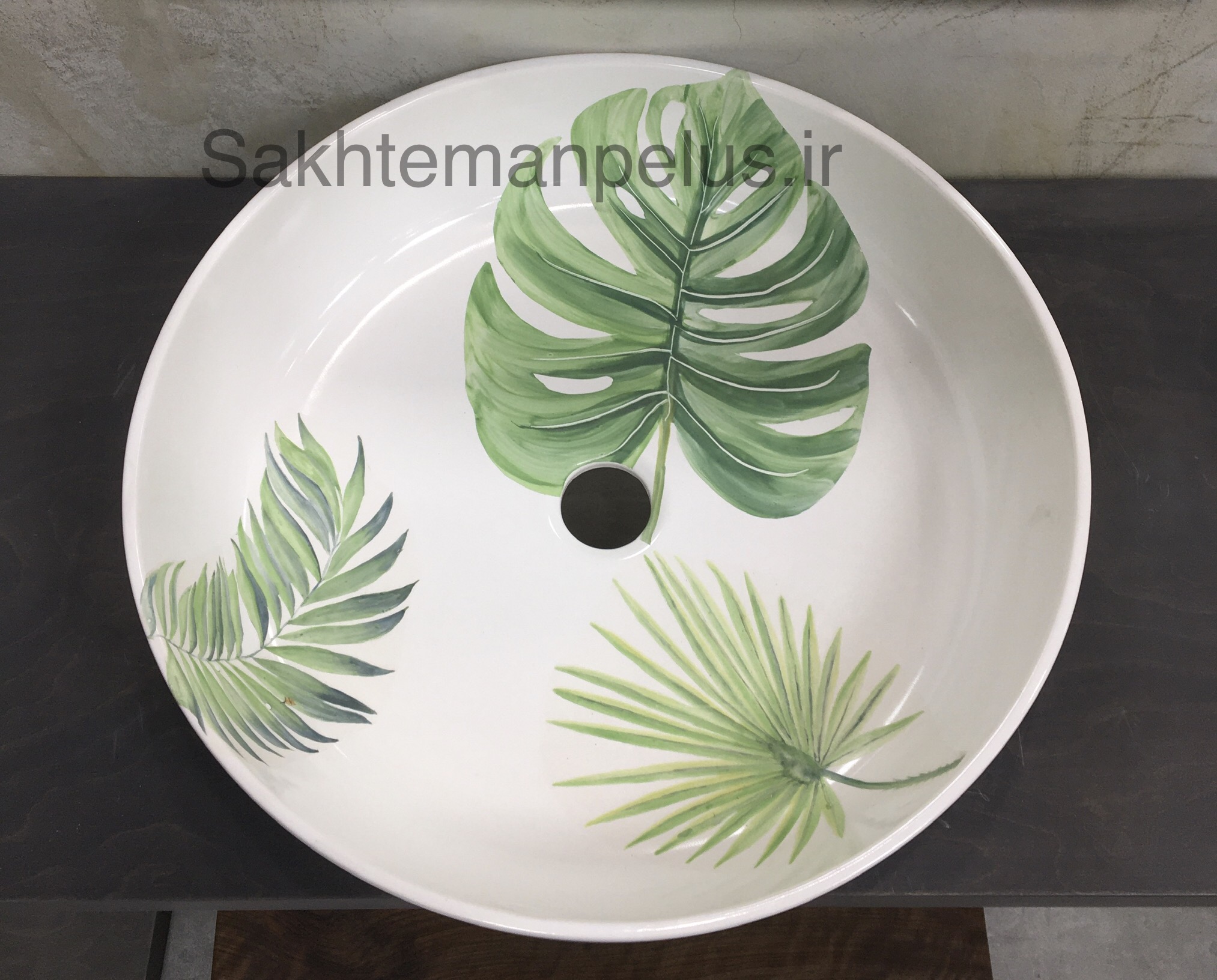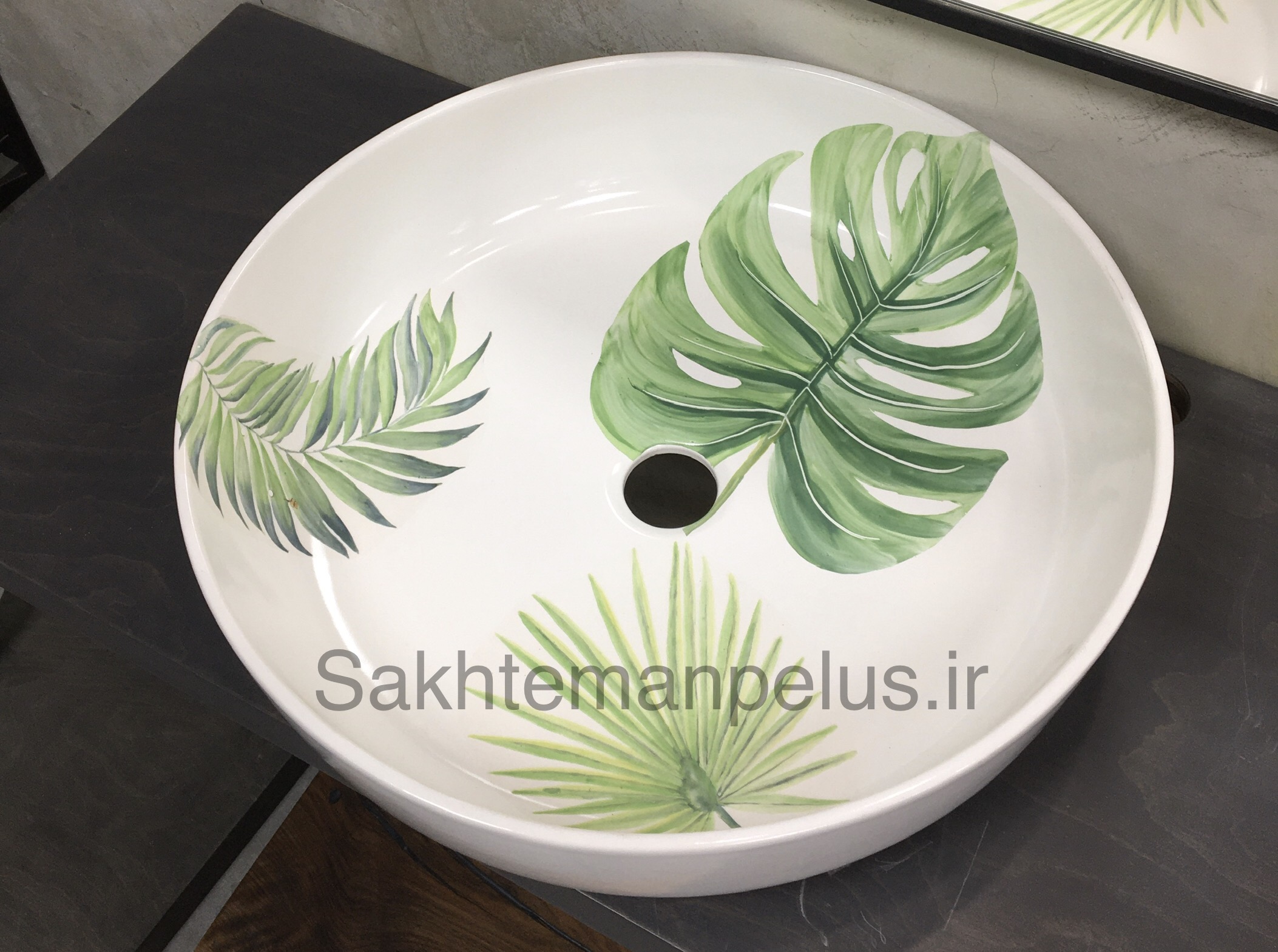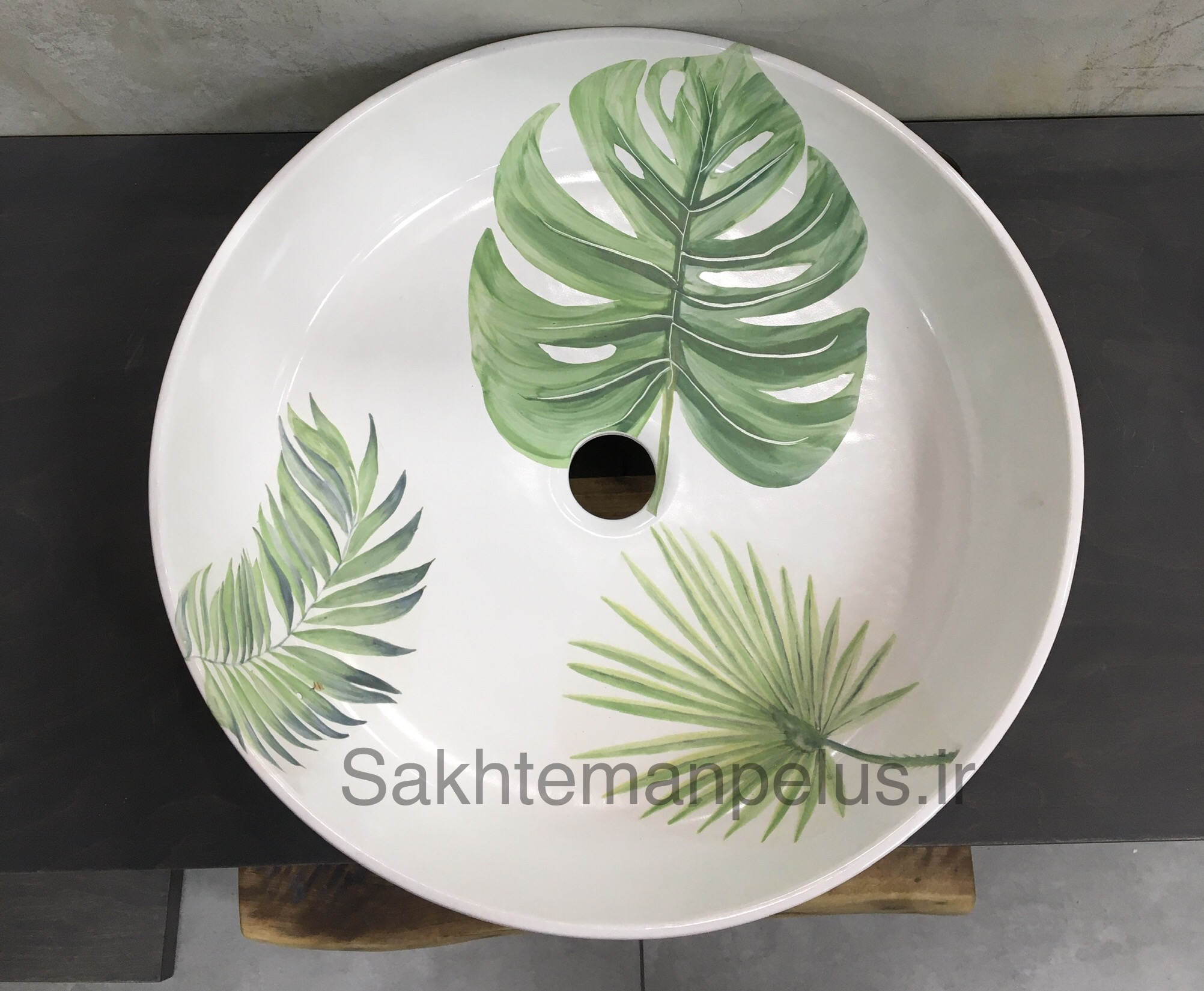 کاسه روشویی رنگی گرد طرح برگ نقاشی