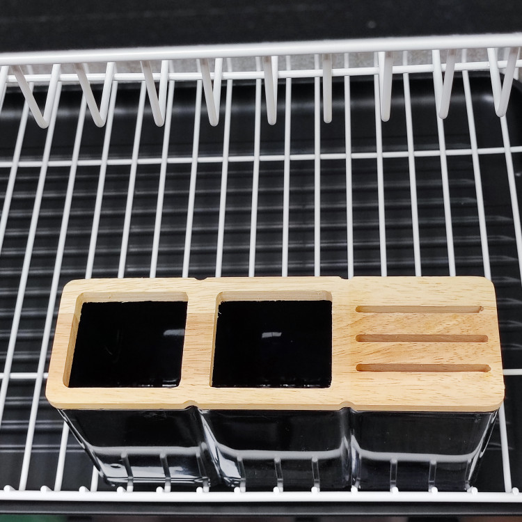 جا قاشق و چنگال : یک محفظه مستطیلی شکل برای نگهداری قاشق، چنگال، چاقو و سایر ابزار کوچک آشپزی به صورت آویز در کنار طبقه بالا قرار گرفته است. این قسمت جاظرفی دو طبقه خود دارای چند بخش برای تفکیک بهتر لوازم است و از جنس مشکی با دستههای چوبی (احتمالاً بامبو) ساخته شده که به زیبایی کلی محصول میافزاید و با دستگیرههای اصلی جاظرفی هماهنگی دارد.